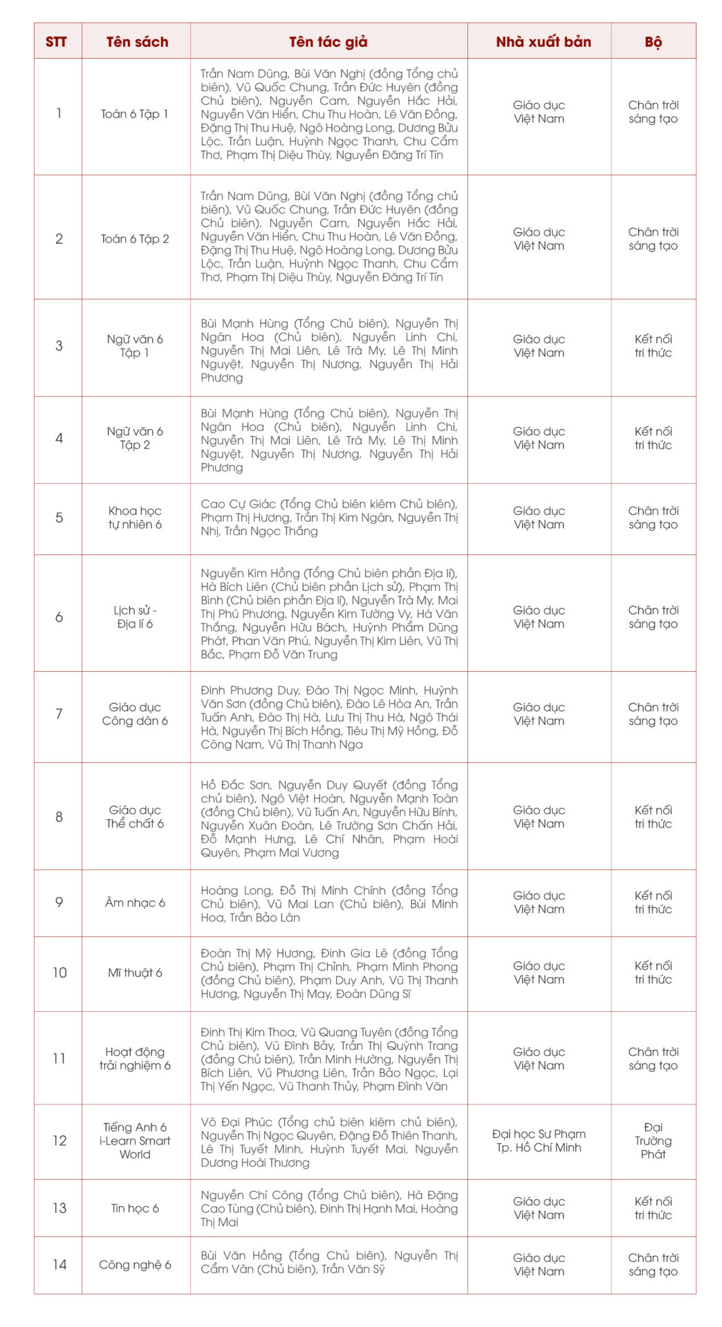 1. Danh mục sách giáo khoa lớp 6: